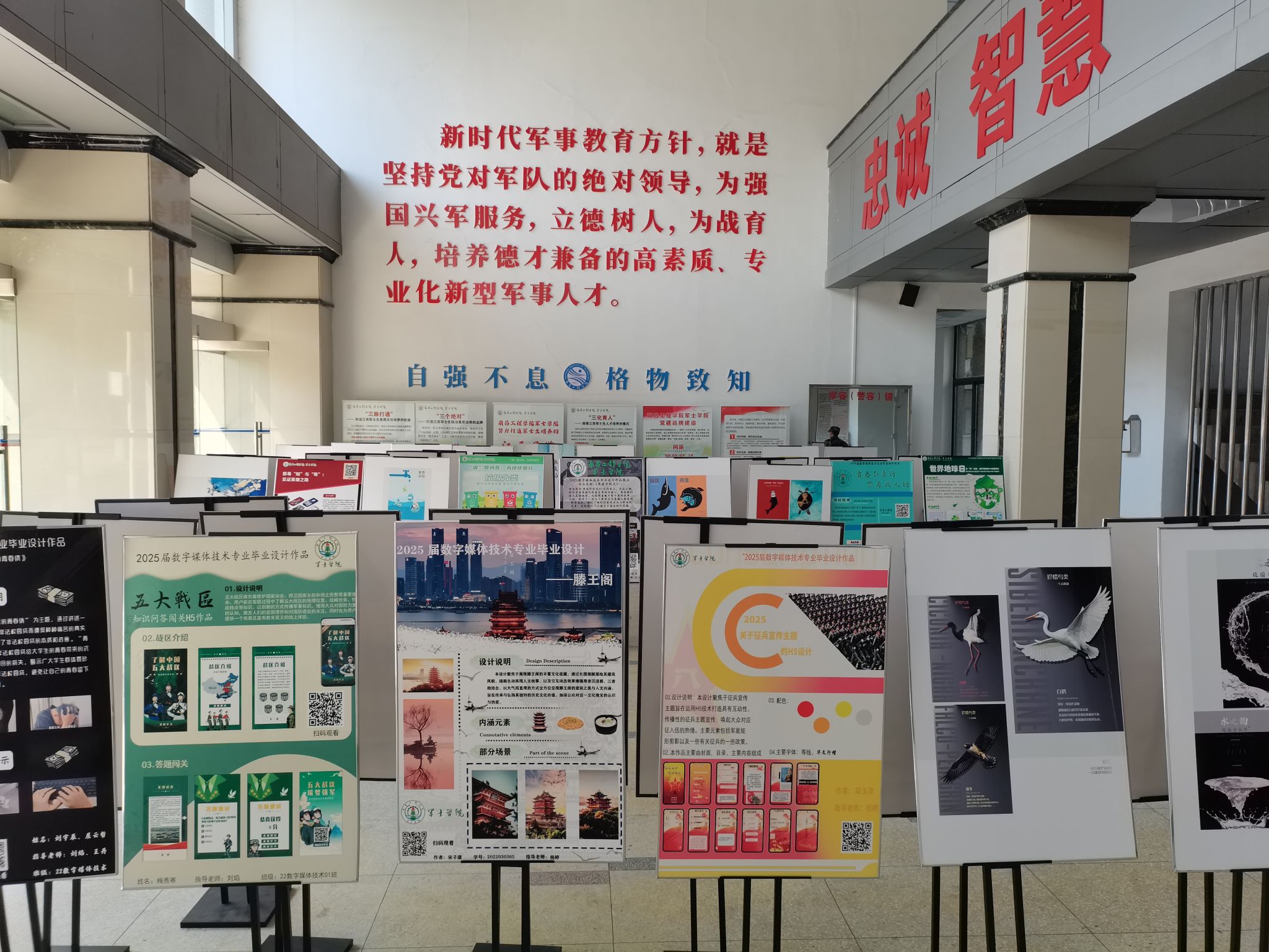 展览集中呈现了涵盖视频创作、H5交互设计、主题招贴及生活题材摄影等四大类别的50件优秀作品。其中,《水之韵》《世界地球日》等作品展现了知识趣味科普和光学影像设计能力,充分展现了军士生扎实的专业功底。