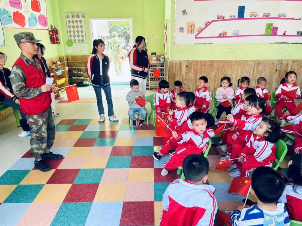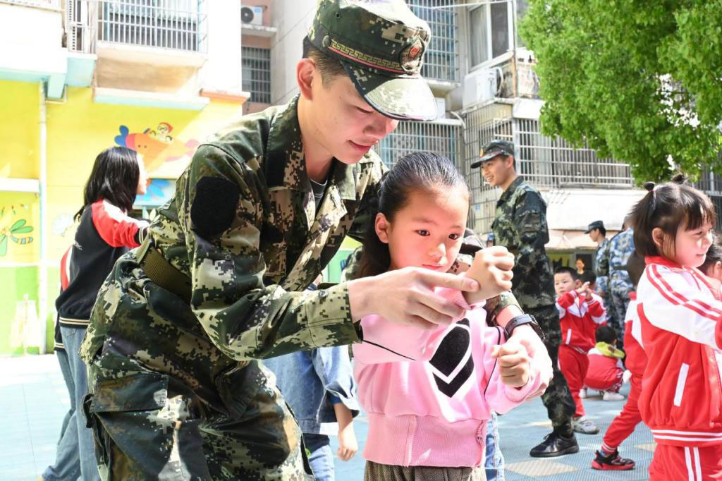 活动在军士生整齐划一的队列行进中拉开序幕,军体拳教学、强军故事会、军歌教唱等环节交替进行,春意盎然的校园中,军士生刚劲有力的嗓音与小朋友们稚嫩的童音交织,谱写出一曲美妙的乐章。